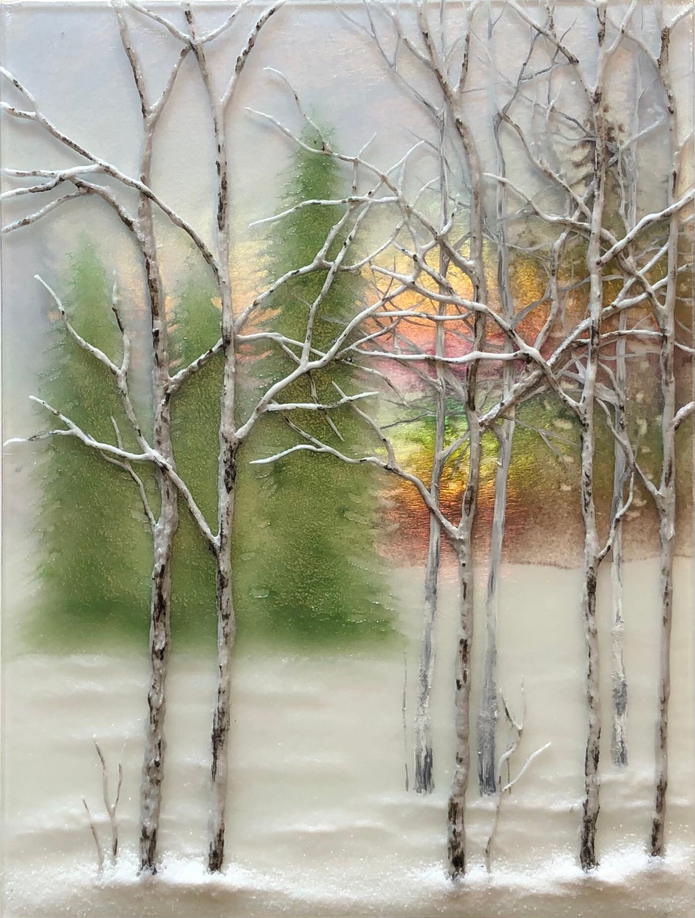 Bring nature inside with this handmade fused glass panel. This beautiful piece has a iridescent background iridescent light blue. The trees and snow give incredible depth and texture. It would be a conversation piece in any room. This is truly one-of-a kind piece of art.